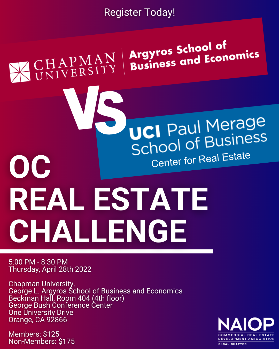 Student teams from the UCI Paul Merage School of Business and Chapman University will compete head-to-head in a real estate challenge on the highest and best use for a proposed site. Potential issues to be addressed may include financial issues, sustainable development and community impact. See the video below for more info.