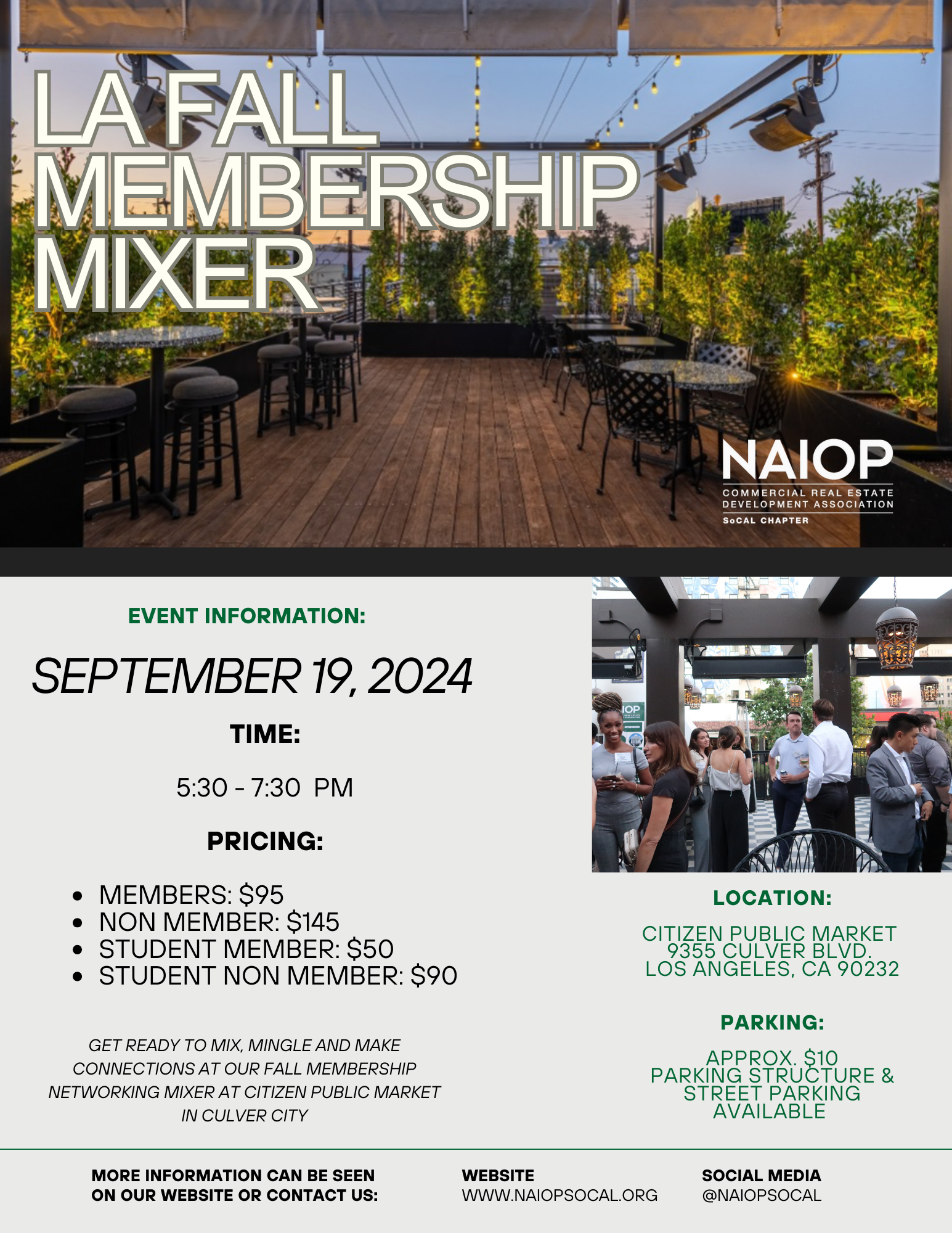 Get ready for an evening of networking and connection at NAIOP SoCal's fall membership mixer. Join us at Citizen Public Market in Culver City and meet fellow industry professionals as you enjoy the vibrant atmosphere of this popular venue. Don't miss this opportunity to expand your network and engage with like-minded individuals in the commercial real estate industry. We look forward to seeing you there!
