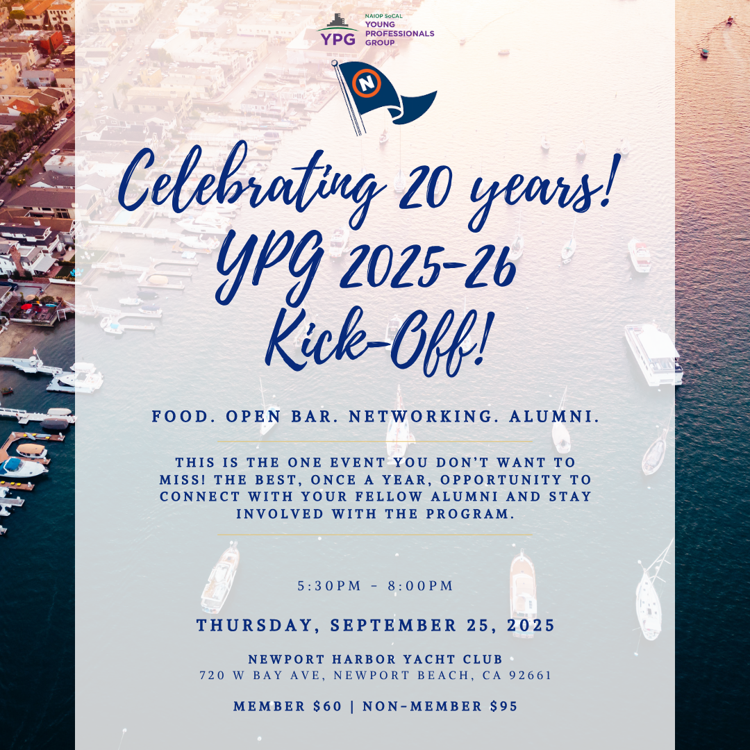 Join us Thursday, September 25th at the beautiful Newport Harbor Yacht Club on the picturesque Balboa Peninsula as we celebrate the 20th YPG class and welcome the newest cohort into our growing legacy of leaders.