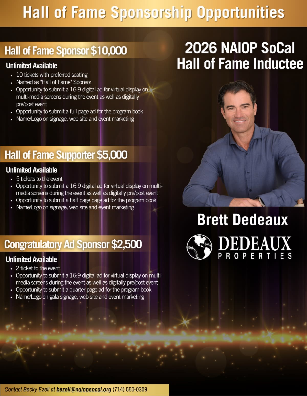 Southern California, CA (February 17, 2026) -- NAIOP SoCal, the leading organization for developers, owners and investors of office, industrial, retail and mixed-use real estate, has announced that Brett Dedeaux, Chief Executive and Managing Member of Dedeaux Properties, will be inducted into its Hall of Fame during the chapter’s 2026 Awards Gala. Under Dedeaux’s leadership, Dedeaux Properties has evolved to become the largest owner/operator of modern IOS and logistics properties in Southern California. Dedeaux owns and operates more than 14 million square feet of industrial real estate with over $1.3 billion of assets under management, spanning cold storage, distribution, transloading facilities, truck terminals, and industrial outdoor storage (IOS). Dedeaux strategically built the firm’s industrial portfolio recognizing a need for modernized logistics facilities, such as truck terminals and transloading facilities, which were being overlooked by the industry.